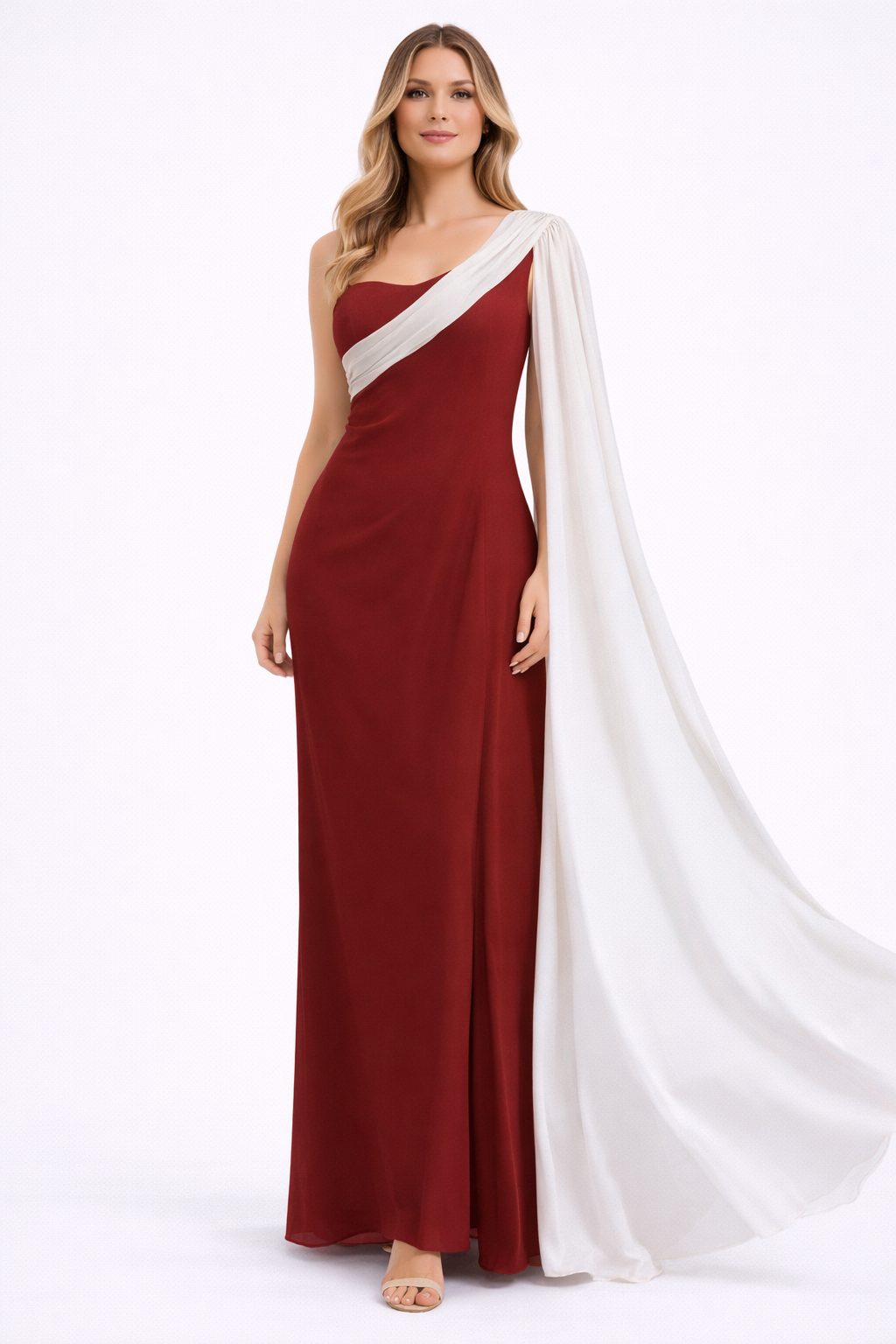 Vestido para invitada, con pieza en contrate de color que cae desde hombro a modo de capita, muy elegante