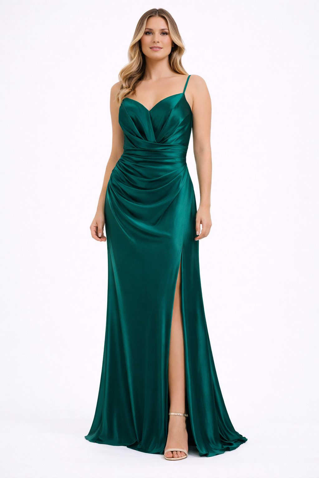 Vestido largo para invitadas, drapeado pecho y cuerpo, tirantes, abertura en la pierna