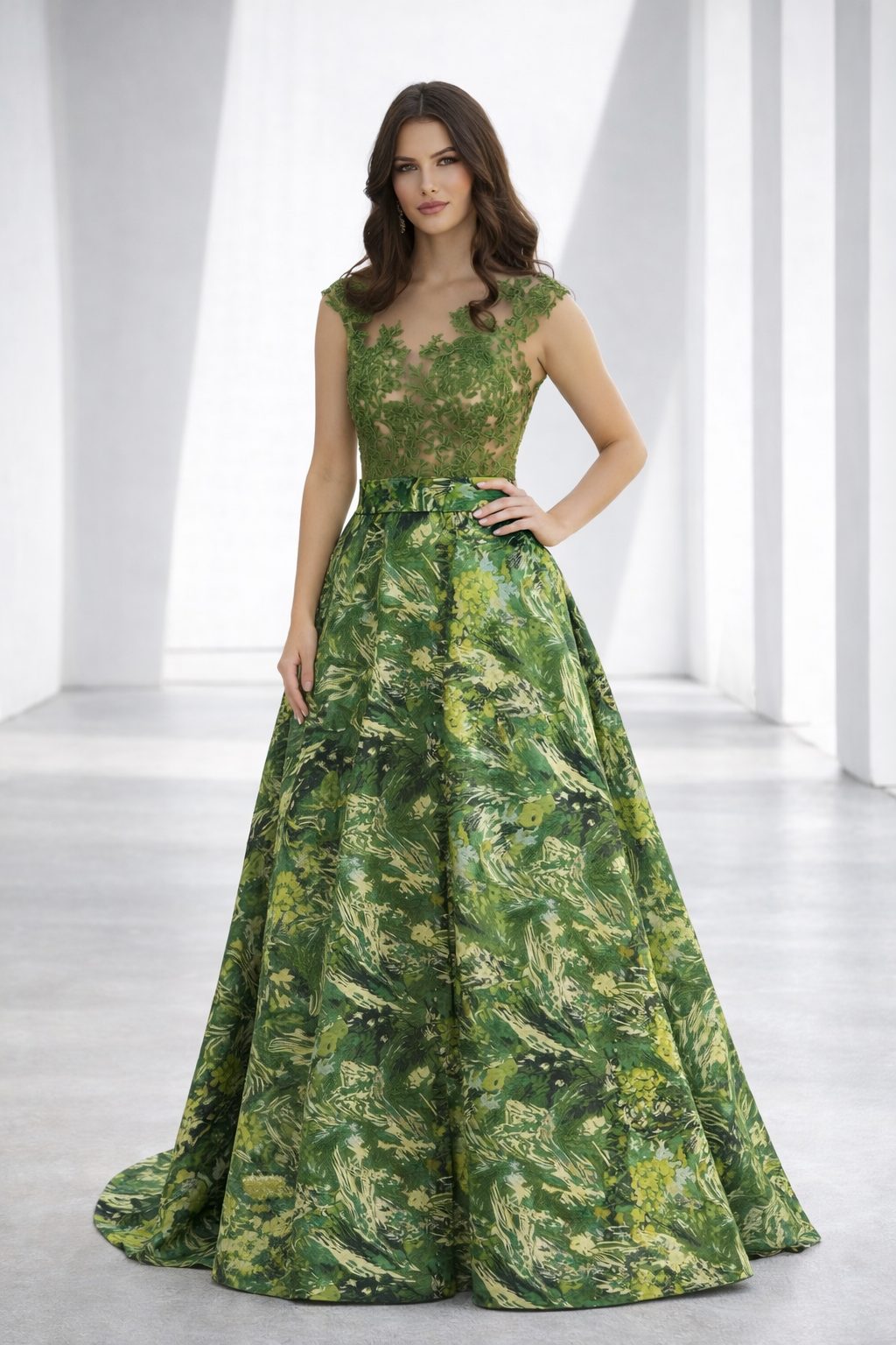 Vestido fiesta corte A, falda estampada y cuerpo encaje al tono con efecto tatuaje