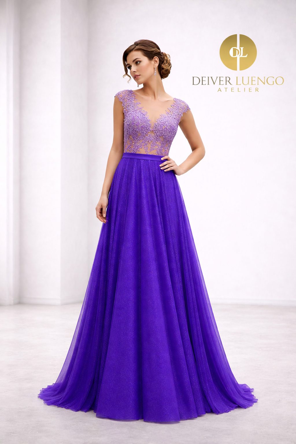 Vestido fiesta elegante, falda capa y cuerpo efecto tatuaje